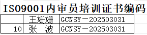 ISO9001內(nèi)審員(yuán)培訓證書(shū $ )編碼 2025.3